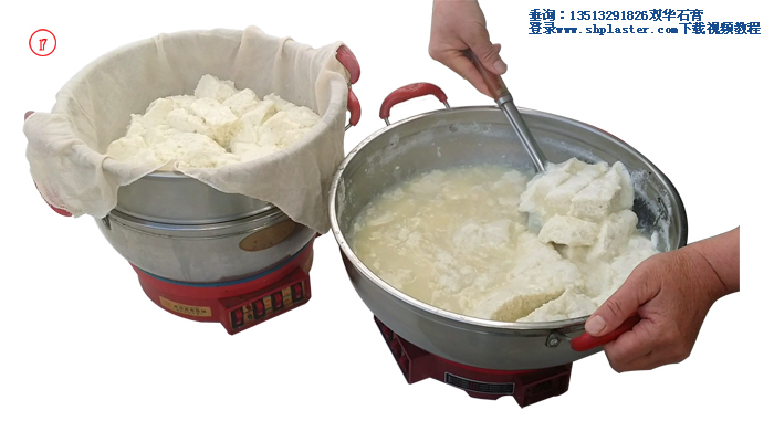 步驟12: 激烈攪拌煮開的豆?jié){,與此同時把石膏漿倒入豆?jié){中,此時豆?jié){的溫度大約在96℃左右。(溫馨提示:豆?jié){溫度越高,所用的食品級點(diǎn)石膏粉的數(shù)量越少,反之則食品級點(diǎn)石膏粉用量越多。如果豆?jié){溫度降到85℃時,食品級點(diǎn)豆腐石膏粉的用量要增加到每100克干黃豆,4克食品級點(diǎn)豆腐石膏粉。)